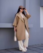 بارونی زنانه بلند بژ با یقه و سرآستین مشکی دو ردیفه کمربنددار استایل شهری کنار قاب پنجره سفید
