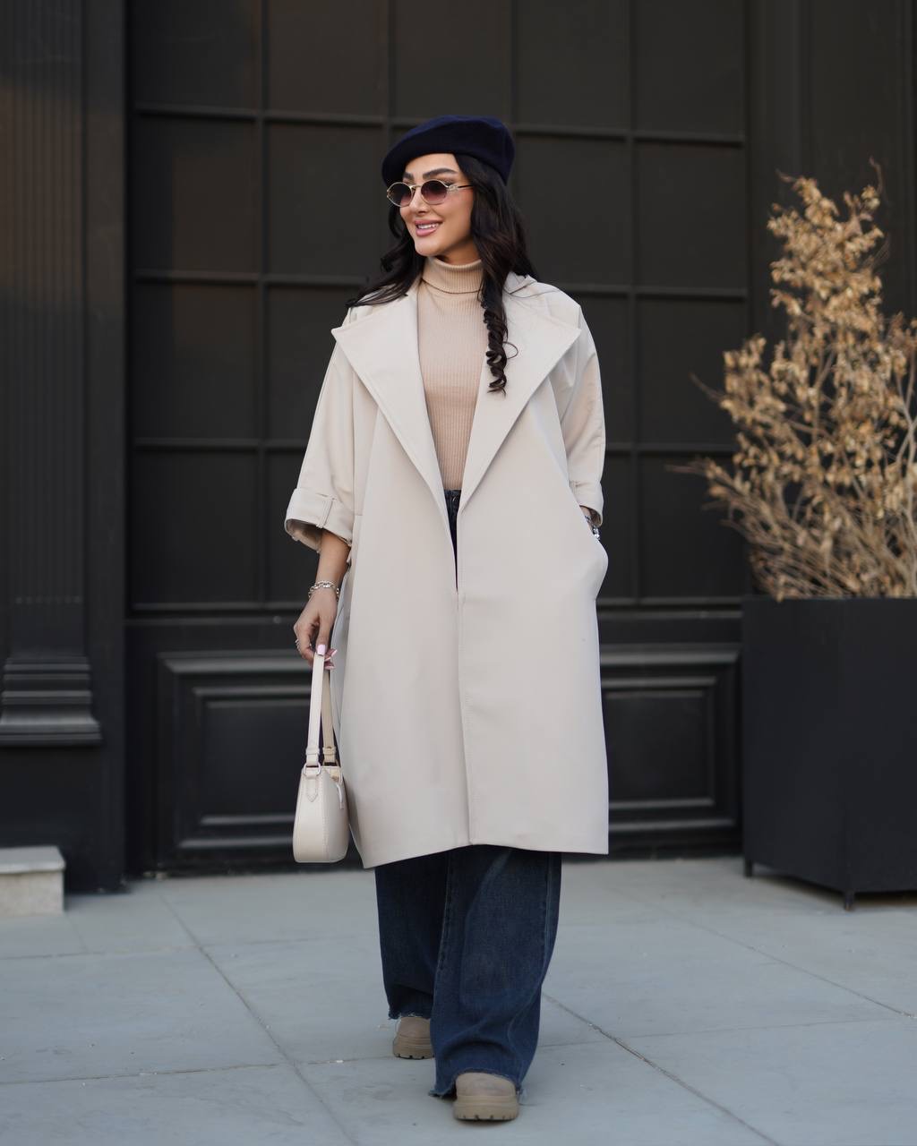 بارونی زنانه بلند سرمه ای دو ردیفه فرم آزاد آستین تاخورده استایل شهری پاییزی کنار دیوار روشن