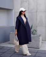 بارونی زنانه بلند دمسه دوزی سرمه ای کمربنددار یقه برگردان نمای تمام قد استایل شهری روی ست سفید