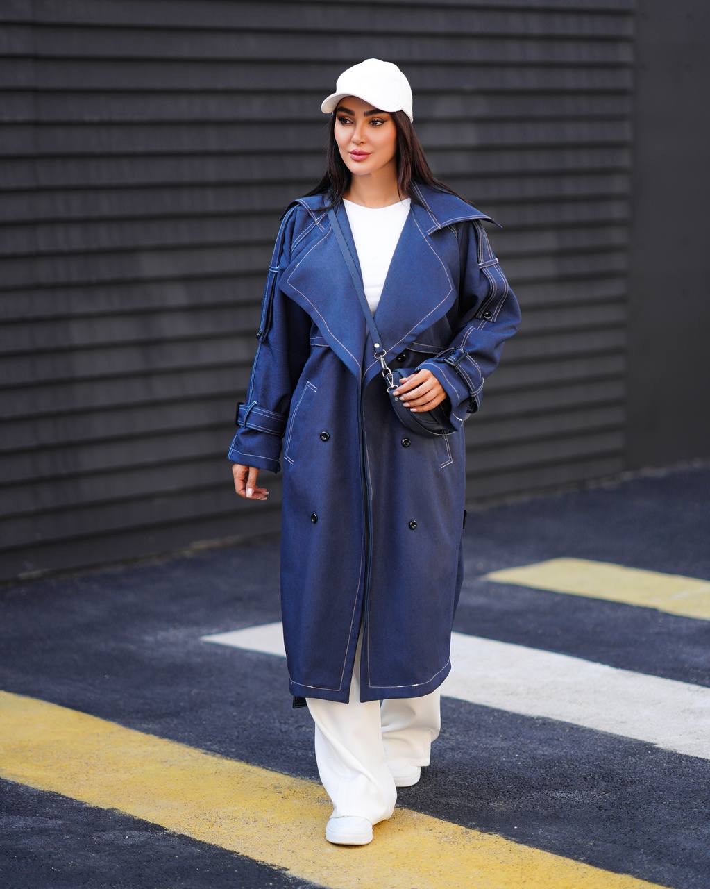بارونی زنانه بلند دمسه دوزی سرمه ای کمربنددار یقه برگردان نمای تمام قد استایل شهری روی ست سفید