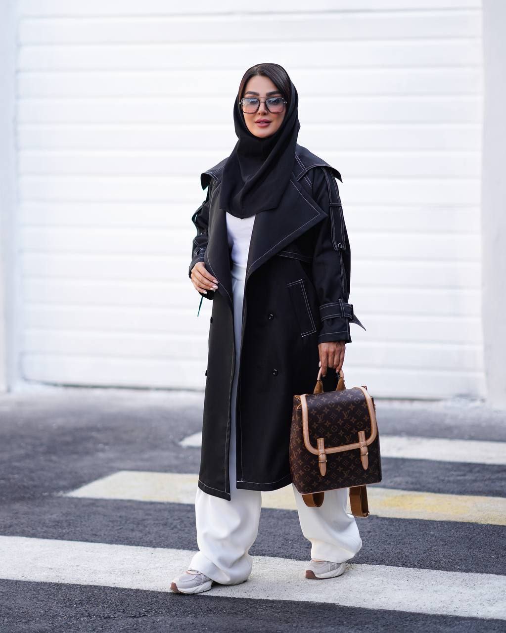 بارونی آمبرلا ست سرمه‌ای روی استایل روشن با شلوار کرم و کفش هماهنگ، استایلی شیک و مینیمال برای فصل‌های خنک