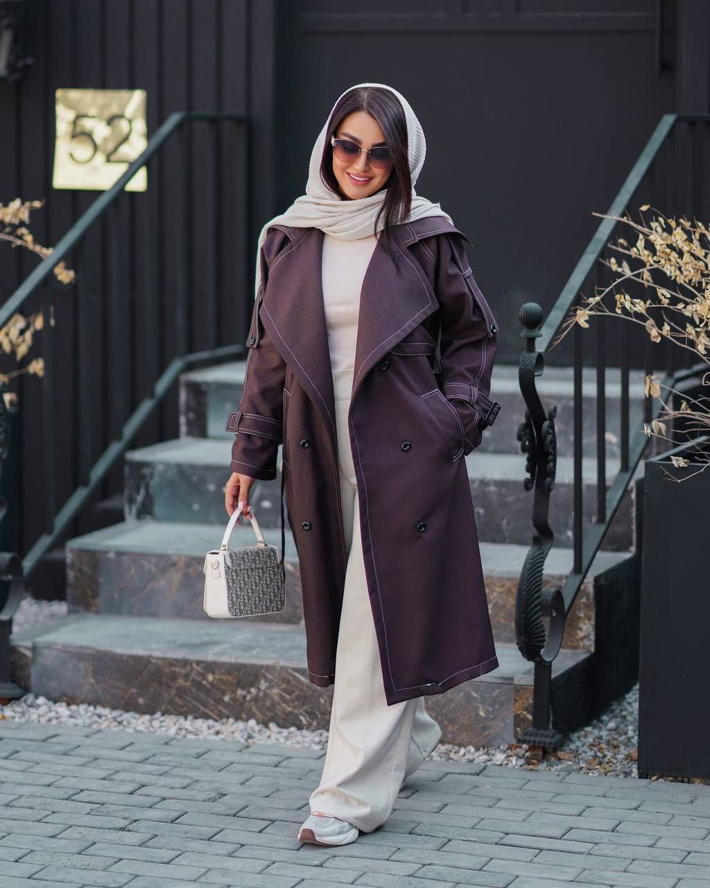 بارونی زنانه بلند دمسه دوزی رنگ شکلاتی کمربنددار یقه برگردان نمای تمام قد در فضای شهری