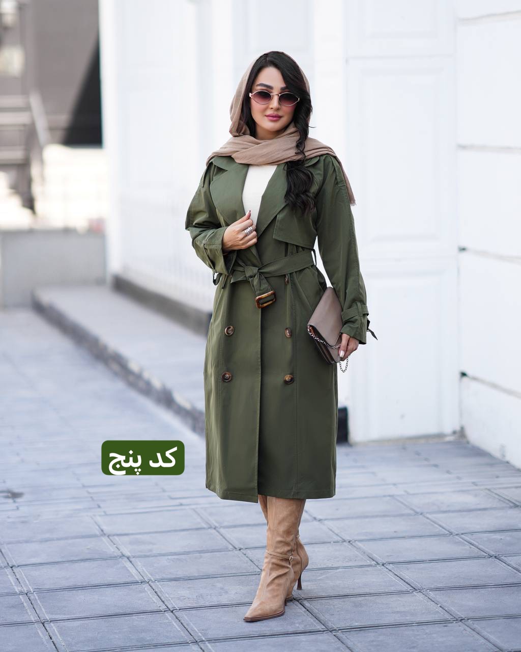 ترنج کت بارونی زنانه سبز زیتونی کمربنددار با بوت بلند، مناسب استایل شیک پاییزی
