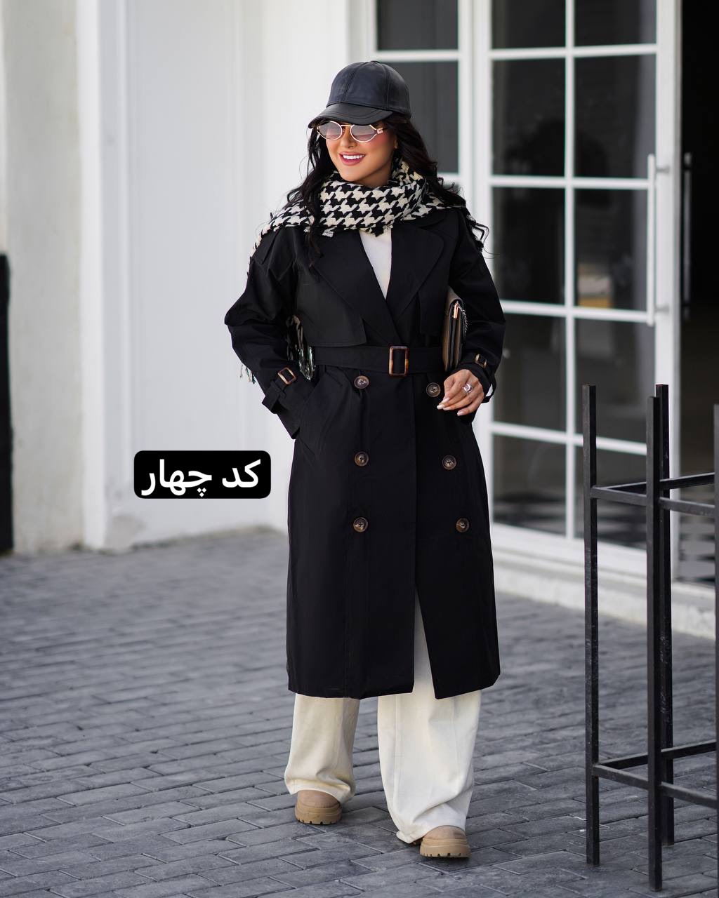 ترنج کت بارونی زنانه مشکی کمربنددار بلند روی شلوار گشاد کرم، مناسب استایل شیک خیابانی