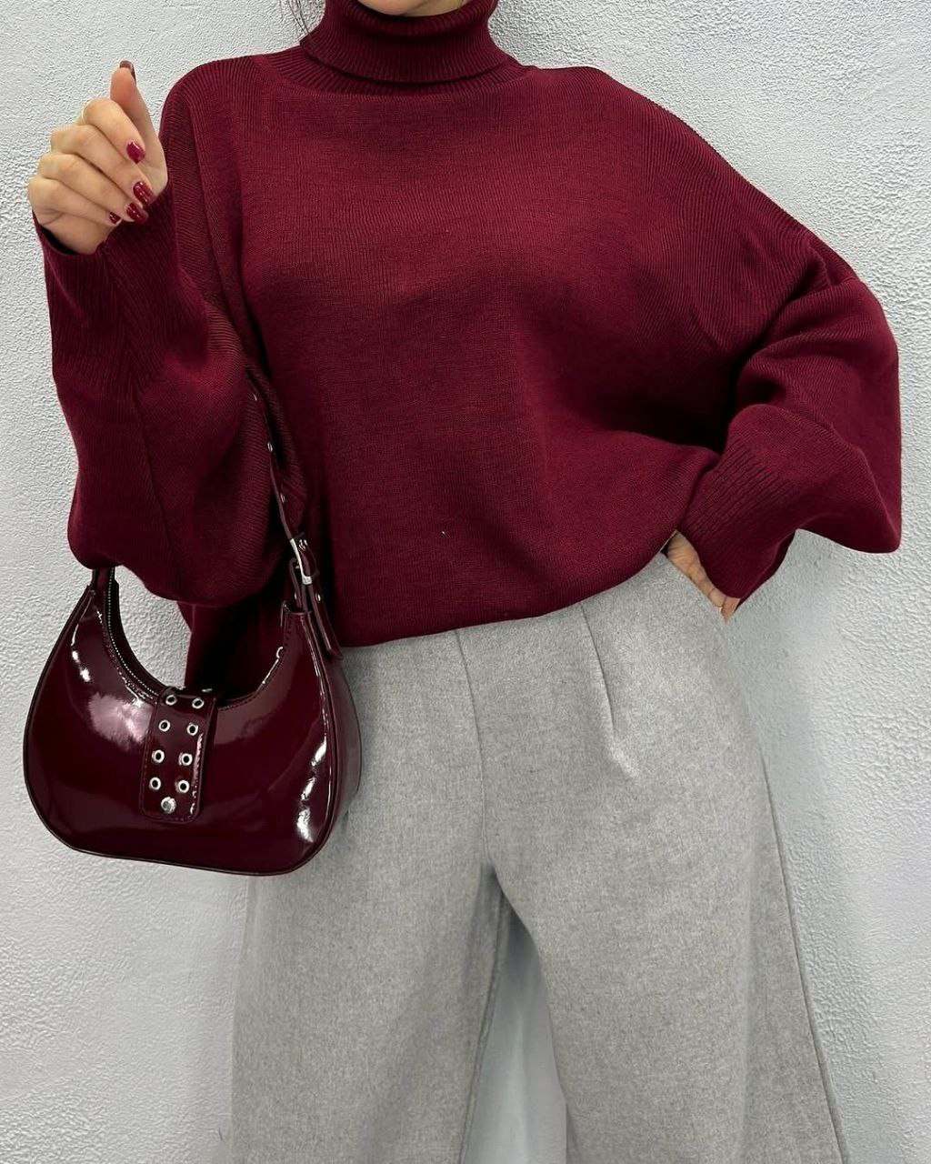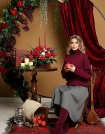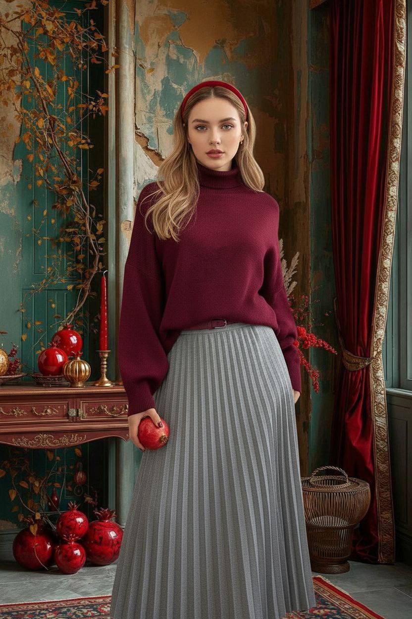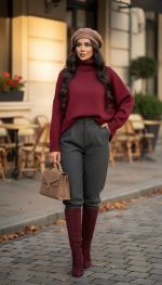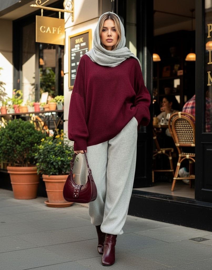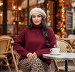 بافت یقه گرد زنانه طوسی با طرح هندسی روی سینه و آستین‌ها، ست شده با شلوار مشکی و کلاه سفید زمستانی