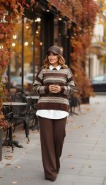 پانچ زنانه کتان کجراه قهوه‌ای ست‌شده با شومیز سفید، مناسب استایل پاییزی شیک و روزمره