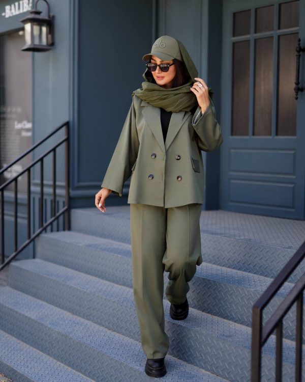 ست زنانه صوفیا راه‌راه با جلیقه و شلوار سبز، مناسب استایل رسمی و نیمه‌رسمی