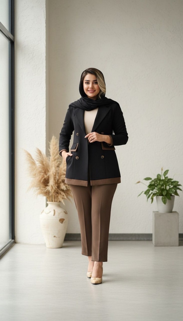 کت مشکی ترکیب با شلوار قهوهای