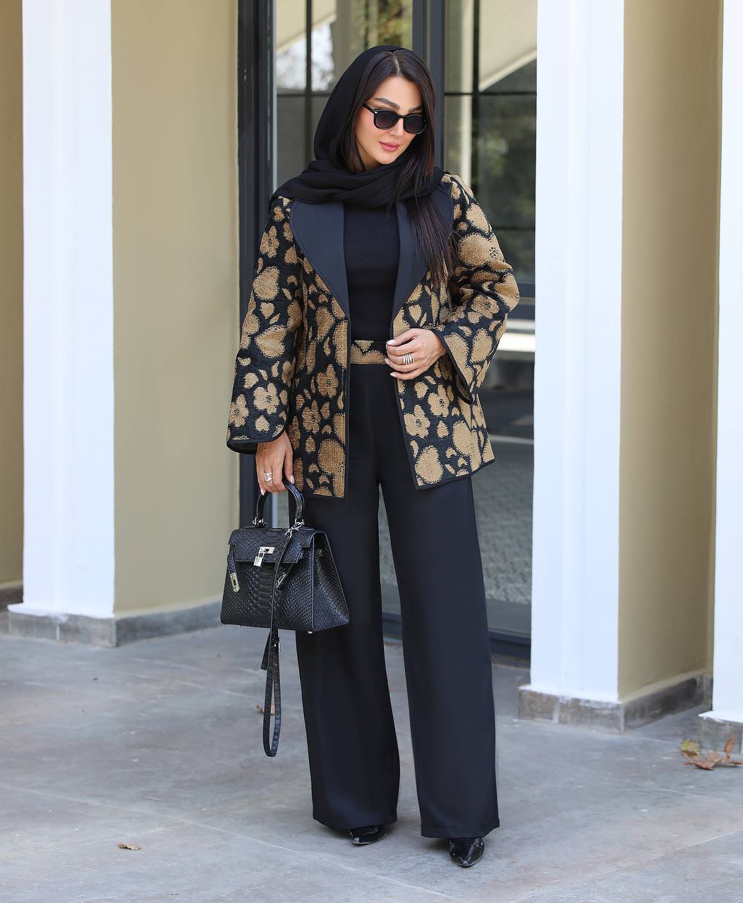 «لبه های کت گان کشی شده و قسمت کمر شلوار از پشت کش میخوره و قسمت جلوی شلوار کمری از جنس کت دوخته شده »