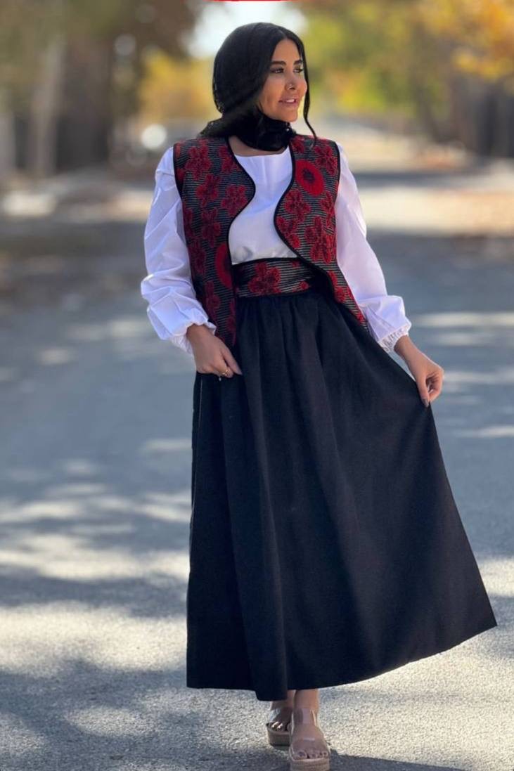 این ست سهتکه از یک شومیز روشن و ساده، یک جلیقه کوتاه قرمز با طرحهای الهامگرفته از پارچههای سنتی و یک شلوار دامنی مشکی خوشفرم تشکیل شده است. شومیز، جنس لطیف و خنکی دارد و روی پوست بدن حس خوبی ایجاد میکند، یقه و سرآستینهای تمیز و مرتبش هم باعث میشود استایل کلی، آراسته و تمیز دیده شود. جلیقهی قرمز، قلب این ست است؛ پارچهی طرحدار با گلهای برجسته، لبهدوزی تمیز و برش کوتاه روی کمر، فرم اندام را جمعوجورتر نشان میدهد و کنتراست چشمنوازی با شومیز سفید میسازد.