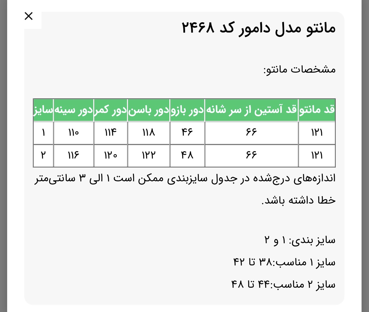 سایز دو : 44 – 46 – 48, سایز یک : 38 – 40 – 42