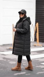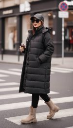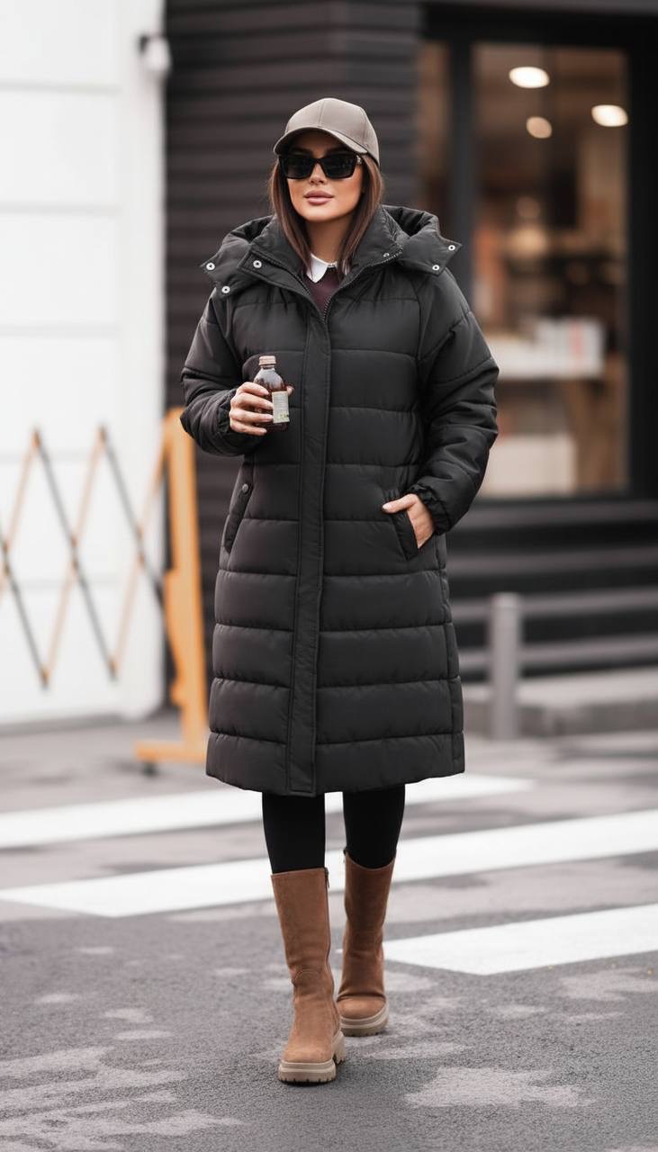 کاپشن بازلیا سرمه‌ای کوتاه روی استایل اسپرت با لگ مشکی و بوت کرمی، مناسب استایل روزمره پاییزی و زمستانی