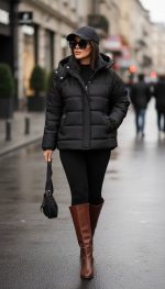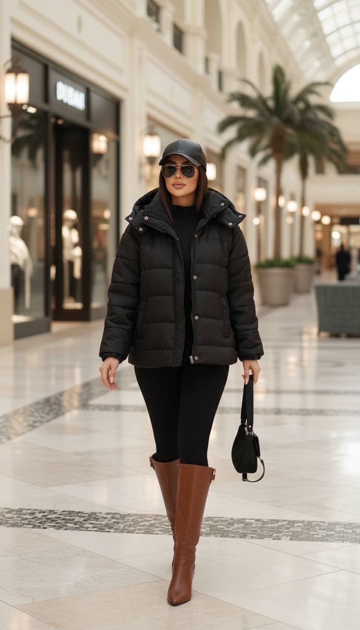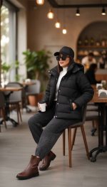 کاپشن سوفی سرمه‌ای کوتاه روی بلوز یقه‌اسکی سفید با شلوار مشکی و بوت کرمی، استایلی شیک و گرم پاییزی روی مبل چرمی