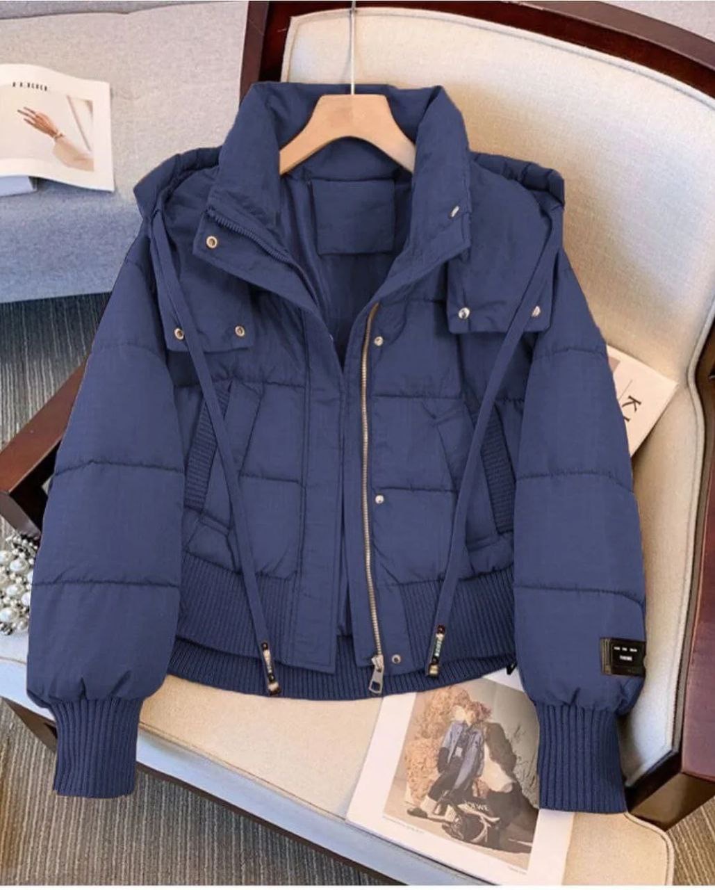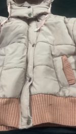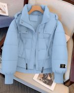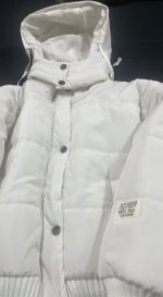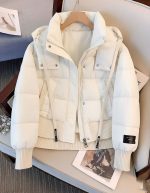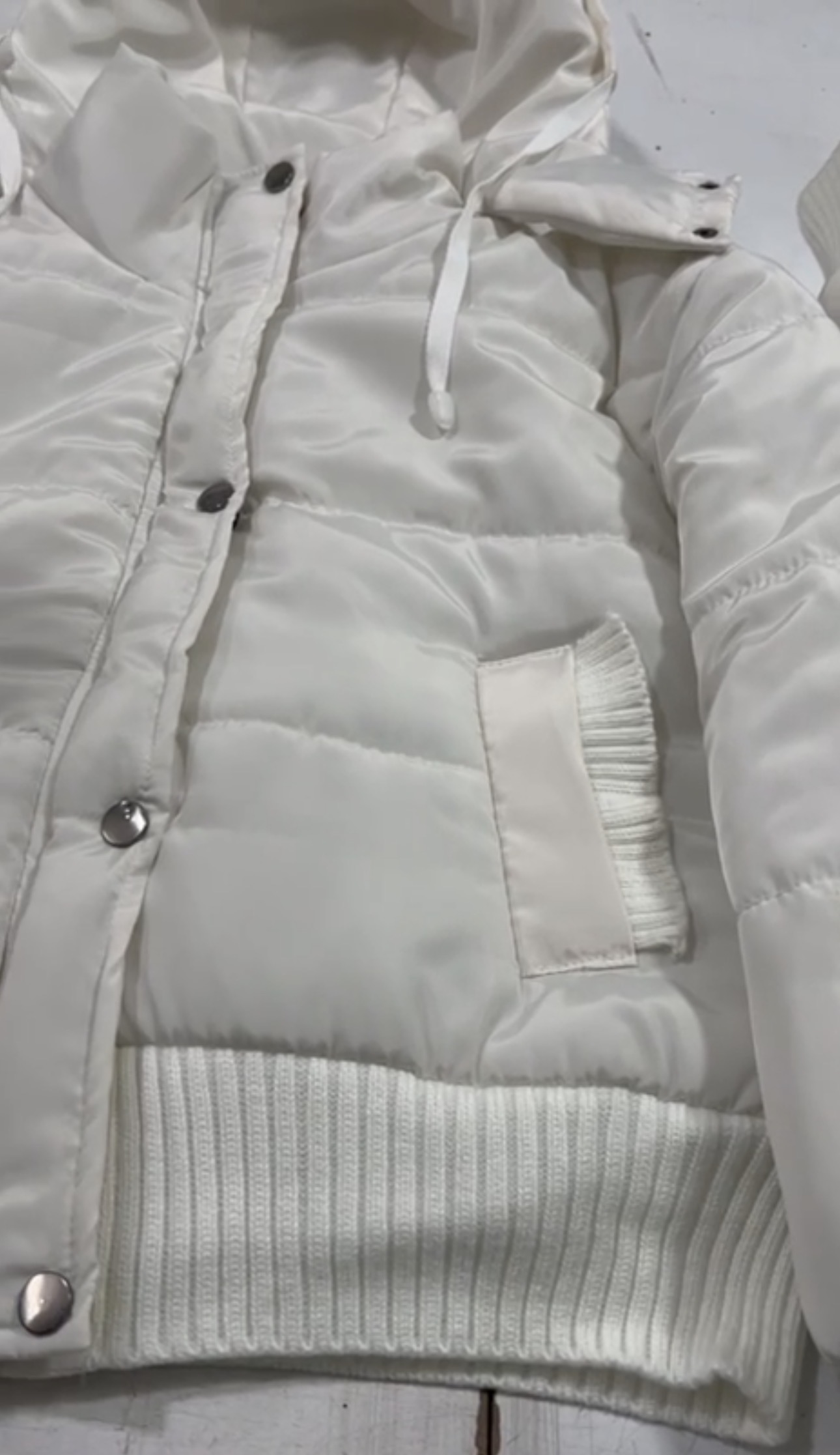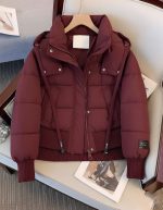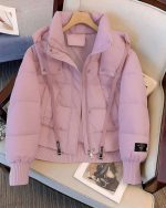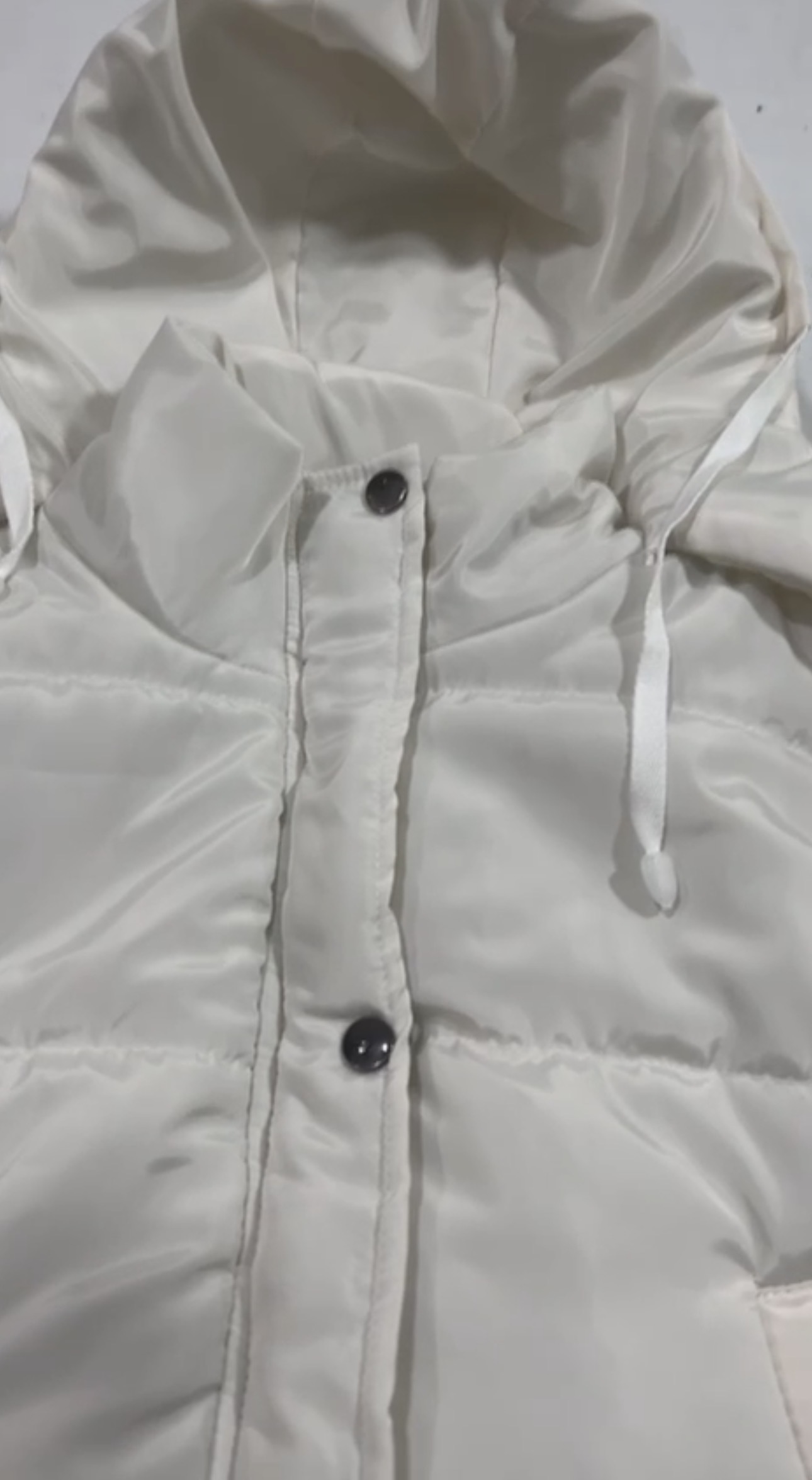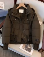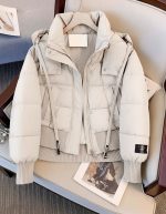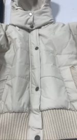کاپشن زنانه کلاه دار کرم زیپ دار کمر گت دار با بند تنظیم استایل شهری زمستانی کنار در شیشه ای