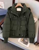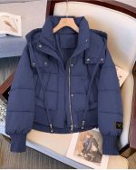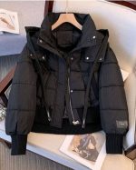 کاپشن زنانه کلاه دار مشکی زیپ دار کمر گت دار با بند تنظیم استایل زمستانی در فضای شهری